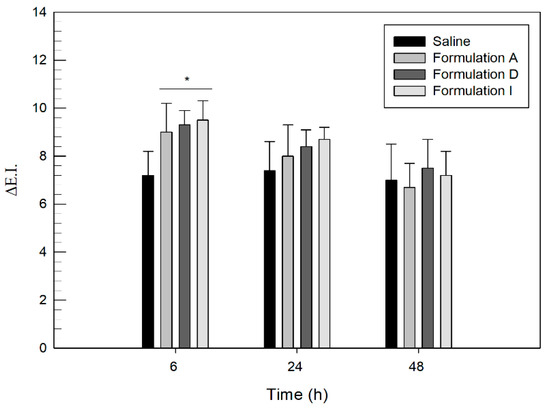 Variation of erythema index (ΔEI) over 6, 24 and 48 h of treatment with saline solution, formulation A, formulation D and formulation I. Results are expressed as the mean value of six independent experiments ± standard deviation. * p value < 0.05 compared to saline solution, used as control.