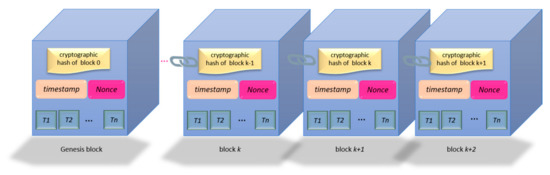 Blockchain is a shared public ledger. The information of the actual transaction is recorded in this ledger. A blockchain consists of blocks, each of which contains a set of valid trades. Each block has a hash code of the previous block, and the link between the blocks is created through this hash; finally, the linked blocks form a chain. The risk of centralized data retention is eliminated with blockchain [17]. The general blockchain architecture is presented in Figure 1 [18].