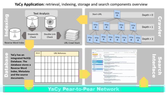 The YaCy framework is divided into five parts, namely, YaCy P2P network, crawler, indexing, database, and search interface. YaCy harvests web pages with a web crawler, indexes, parses, and saves the search index locally. When a peer joins a peer network, its local search index is combined with the network’s mutual index. When a search is initiated, the local index and a global search index f both contribute.