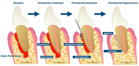Usually, the primary infection is the one to be treated first when the endodontic or periodontal lesion is present and the infection of the other structure has just started [1,3,4,5], but when the second infection is chronic, both endodontic and periodontal treatments need to be conducted [6]. Frequently, the root canal treatment is performed first [5,7], then the treatment of the residual periodontal pocket, which can be more anticipable after a successful endodontic treatment [3]. Scaling and root planning are included in the periodontal treatment, as well as regenerative procedures, which are essential to be taken into consideration for the repair of the damaged tissue (Figure 1) [8]. In a combined endodontic and periodontal lesion, the configuration of the bone defect and the degree of destruction of the periodontal attachment have a considerable influence on the long-term prognosis of the tooth [3]. In case of an advanced periodontal lesion, the success of the therapy revolves around the possibility of filling the defect using regenerative procedures [3].