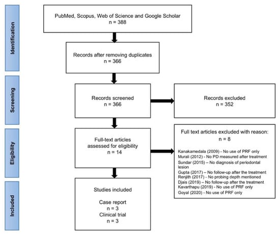 MEDLINE (through PubMed), Scopus, Web of Science and Google Scholar databases were searched to find all relevant studies published in English from date of inception up to April 2021. The following combination of keywords was used: (“endodontic-periodontal lesion” OR “endo-perio lesion” OR “endo-periodontal lesion” OR “endodontic periodontal” OR “endoperio”) AND (“platelet-rich fibrin” OR “PRF”). Titles and abstracts of retrieved articles were assessed for eligibility and those who were on the topic of this review were excluded. Full texts of articles previously obtained were read and assessed for inclusion. For further studies, the reference lists of the included articles were searched.