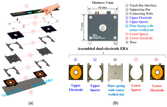 Figure 1. Haptic touch bar interface based on dual-electrode ERA: (a) An exploded perspective view of the touch bar interface design consisting of two dual-electrode ERAs and a long, narrow touch display; (b) assembled dual-electrode ERA and its components.