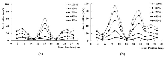 Figure 5. Acceleration along the beam, exciting a single actuator, varying the actuator’s magnitude between 50 and 100% at a frequency of: (a) 168 Hz; (b) 196 Hz.