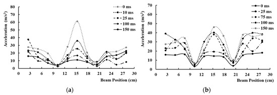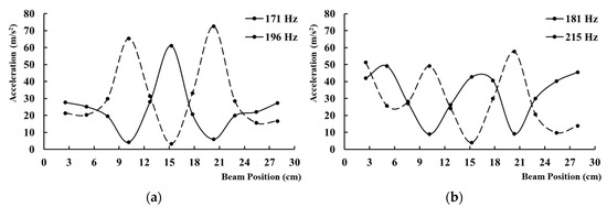 Figure 6. Acceleration along the beam, exciting both actuators at: (a) 171 Hz, varying one actuator’s pulse excitation duration; (b) 181 Hz, varying one actuator’s pulse excitation duration.