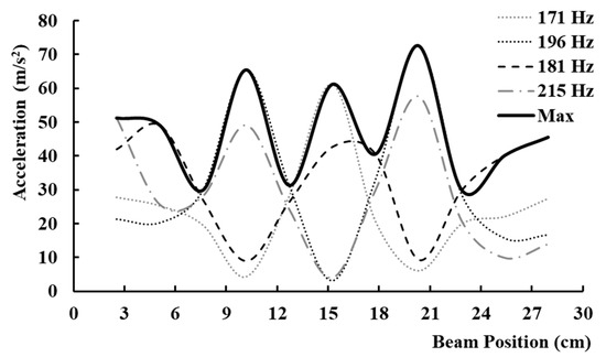 Figure 5b shows the vibration along the beam, exciting it at 196 Hz with one actuator. The maximum peak-to-peak accelerations that occurred were 97.77 and 86.59 m / s 2 , occurring at 11.4 and 19.1 cm, respectively. Three node points are present around 6.4, 15.2, and 24.3 cm. At 15.2 cm along the beam, the acceleration is below 9.81 m / s 2 even when the actuator’s magnitude was at 100%. At 6.4 and 24.3 cm, the acceleration is below 39.2 m / s 2 , with the actuator’s magnitude at 100%. As expected, decreasing the magnitude of the actuator proportionally lowers the magnitude of the response in the beam. Once the actuator reaches 50% magnitude at 196 Hz, it produces an insignificant response, with the acceleration below 9.81 m / s 2 throughout the beam.