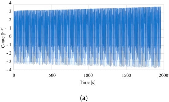 The power profile is repeated 23 times to cover a distance of 22 km, totaling a time of 1960 s, while the value of the electric current to be extracted from the battery is calculated based on its state of charge according to Equation (1), separate from the voltage at the output of the battery.