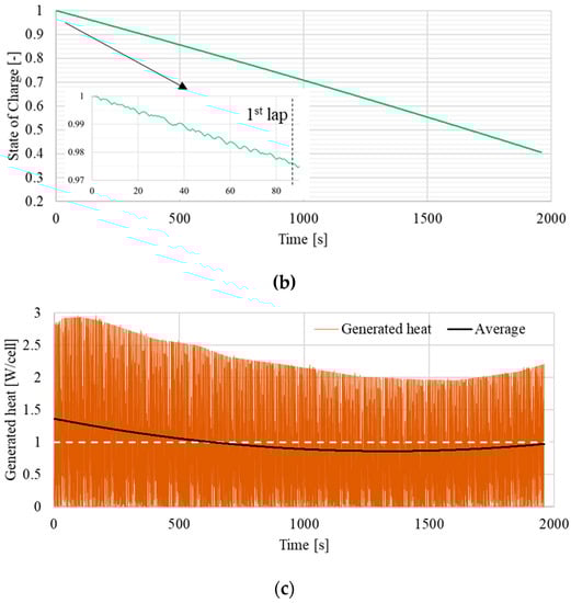 where the internal resistance Rint is taken from a map according to the discharge rate and the state of charge (Rint = f (C-rate, SoC)) and, using the experimental measurements performed by Drake [], T represents the temperature and dEOV/dT is the entropic coefficient. The C-rate and SoC of the battery are shown in Figure 4a,b, respectively. Thus, the profile of the heat generated by the battery cells during the endurance race is represented in Figure 4c, the average for the 1960 s being ~1 W/cell.