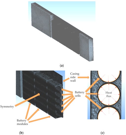 In order to reduce the influence of mesh number on the result, the grid independence test was performed by checking the average heat transfer coefficient on the surface of battery cells with refining mesh, until a difference of less than 1% was achieved. The obtained mesh system consisted of about 12.7 million elements (Figure 5a).