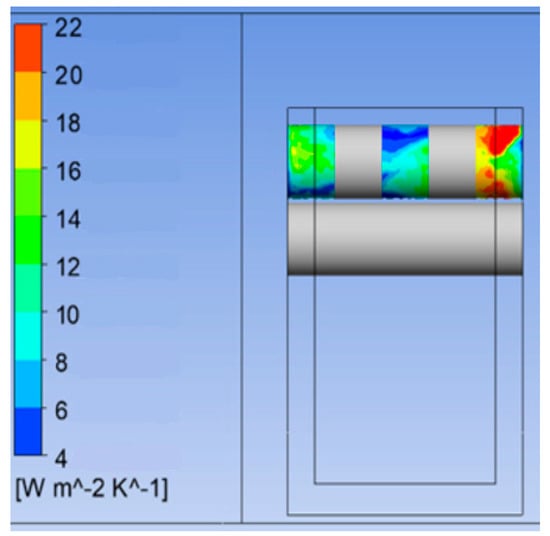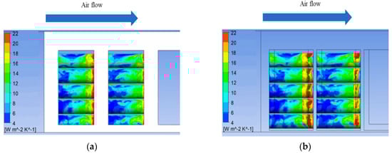 Distribution of the heat transfer coefficient on the cells’ surface (a) with visible battery segment housing; (b) with hidden battery segment housing.