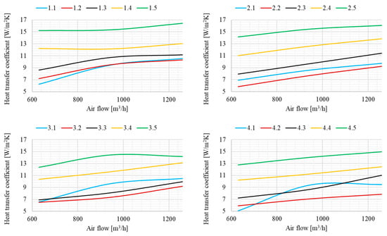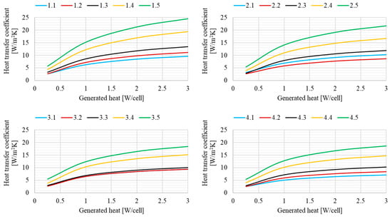 In Figure 9, the general tendency of higher heat transfer coefficient values at the end sections of a cell (j = 4, 5) can be observed, based on the illustrations seen in Figure 6. The explanation of this tendency is that the segment housing obstructs the air from cooling the front sections of a cell (j = 1, 2) and it only starts coming into contact with the accumulators at their middle section. This means that at the front sections of each module’s cells, there is some static air that heats up and therefore considerably reduces the cooling capacity.