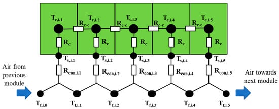 Coolant, in this case the air, is heated after passing next to each cell section, with this heating being influenced by the temperature of the cooled surfaces and the flow characteristics, according to Equation (8):