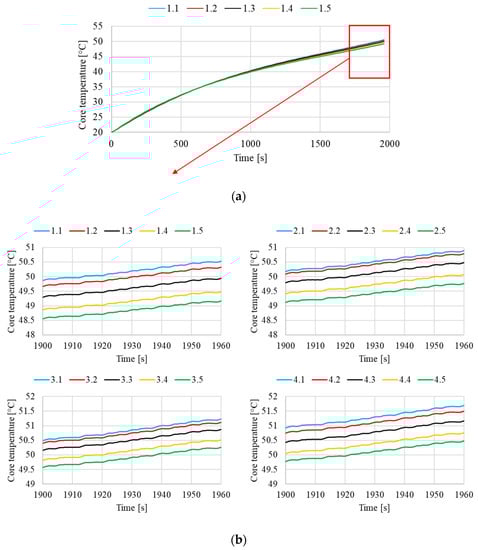 Therefore, the higher the heat transfer coefficient values, the bigger the difference between the sectioned and the non-sectioned mathematical model. This gap could become more significant when studying cooling systems with higher cooling capacities, such as an active forced air cooling system (using refrigerated air) or a liquid cooling system, which requires special attention in the procedures of the design and development of a battery’s thermal management system.