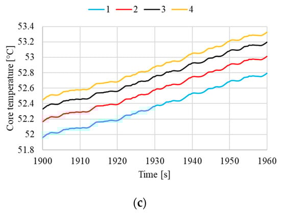 Battery core temperatures (a) in the 1st module; (b) in all 4 modules in the last minute; (c) in all 4 modules in the last minute, using the non-sectioned model.