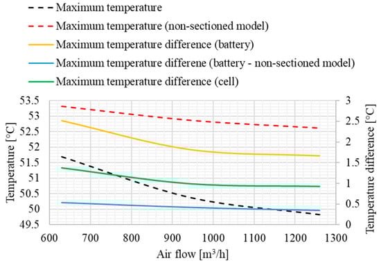 The same conclusion can be drawn when analyzing Figure 14. The increasing air flow (and therefore the increasing heat transfer coefficient values) has a less significant impact on both the maximum temperature and the temperature uniformity for the non-sectioned model. When doubling the air flow, the maximum temperature dropped by only 0.7 °C compared to 1.85 °C in the sectioned model. Similarly, the maximum temperature difference in the battery segment is reduced by 0.2 °C compared to 0.85 °C in the proposed model.