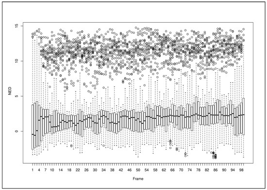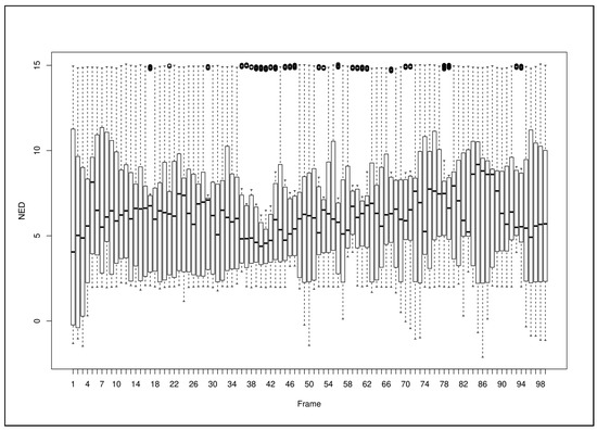 Figure 6, the boxplots of the first 100 of 233 frames of the audio files are shown for the congruent and non-congruent readings, respectively. It is possible to highlight the increasing value of the average NED according to the increasing number of frames. This result can be explained by the nature of an analog recorder, which is not able to provide a constant speed of tape reading. Indeed, the differences become more evident for longer readings than for shorter ones. Therefore, the dataset was reduced to the first 100 frames, since the analysis of variance showed a low correlation between NED and the frames, as shown in