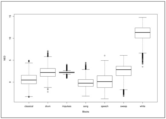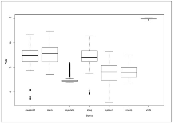 Figure 8 show the boxplots for each block for the congruent and non-congruent comparisons, respectively. The most evident results are the differences of the average NED values that increase for the non-congruent comparisons. The biggest differences are shown in complex signals, that is, they are less constant in time and have a wide band spectrum. For instance, the average value increases more for the drum, song and white noise with respect to the train of impulses or the sweep. The average values are shown in