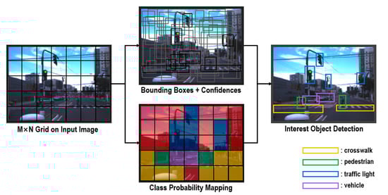 Figure 2a shows the occlusion phenomenon where it is difficult to detect the crosswalk, because it is occluded by the vehicles in front. Figure 2b shows the occlusion phenomenon where the crosswalk located at the center is occluded by the shadow of the vehicles in front. In addition, due to the limited size of the image input from the self-driving vehicle, the crosswalk located to the right is cut and only partially shown, making it an occluded object that is difficult to detect. As described, in a self-driving situation, there is a problem that occluded objects that are difficult to detect occur depending on diverse road environmental conditions such as climate and traffic volume. Ning, C. et al. [25] released a pedestrian detection survey to consider occlusion. The results of the survey show that modern method-based algorithms using deep learning are more powerful than conventional method-based detection algorithms that manually select pedestrian features. Nevertheless, existing deep learning-based object detection algorithms to solve occlusion problems have several issues to improve. The first is the training data problem, which, when the amount of data is small, does not provide a good detection effect with current algorithms. This can be overcome by optimizing data augmentation to increase the amount and quality of training data. The second is the problem of accuracy and speed, and in most detection algorithms, detection accuracy and detection speed have a trade-off relationship, so it is important to design an efficient algorithm with both accuracy and detection speed depending on its application. Kulkarni, R. et al. [26] proposed a faster R-CNN-based object detection model using transfer learning. This modeling method based on pre-trained transfer learning reduces the time complexity required to develop a neural network model. However, because a faster R-CNN, a two-stage detector, is used as the base model, the method is limited in that the real-time object detection processing speed is relatively low. In addition, since the data pre-processing optimization is not taken into consideration in the model learning process for detecting the objects of interest, additional challenges relating to that problem remain. Among the most common data imbalance problems is the foreground-to-background imbalance problem, which refers to the presence of extreme imbalances between the number of positive examples and negative examples. This causes over-fitting and is a major factor in reducing detection accuracy. Therefore, various top-down and bottom-up approaches must be considered to improve this. As described, a number of self-driving related studies are being continuously conducted to detect the objects of interest under diverse environments and conditions.