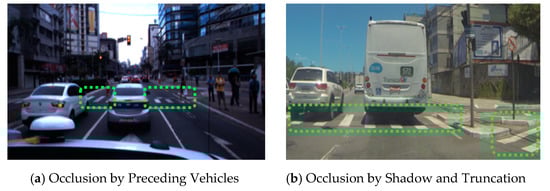 The core technologies of self-driving are divided into the recognition, determination, and control phases [20]. In the recognition phase, the multiple sensors within the self-driving vehicle are utilized to precisely identify the near and far objects. Once the objects are recognized, in the determination phase, a high-quality self-driving mechanism is implemented through the human-level surrounding environment identification and road driving learning processes. In the final control phase, the control system of the self-driving vehicle is operated based on the recognition and determination results, and actions suitable for that particular situation are taken. At this point, in the process of understanding the road traffic situation and surrounding facilities, object detection technology using deep learning is applied. The recognition process using object detection during self-driving results in different actions on the road depending on the performance differences [21]. This is a really important process, since it has a direct influence on road safety. Accordingly, a number of studies are being actively conducted to improve the object recognition and detection performances. Aslani, S. et al. [22] proposed an optic flow estimation algorithm based object detection and tracking process by taking into consideration the moving direction and size of the feature points of objects among frames in the image input phase. This model uses a median filter to effectively remove diverse types of noises in a traffic situation. However, since the involved study is a process based on the image sequence of static camera images, it is difficult to detect the prompt changes made in a continuously and dynamically changing self-driving environment. In addition, since the occluded objects were not taken into consideration in the process of detecting, filtering and dividing the objects of interest from the static image sequence, the model was limited in that the detection performance may be significantly degraded when the objects of interest are partially occluded by other objects. In the process of using the median filter, occlusion objects are likely to be judged as noise, and there is a point to be improved that occlusion objects do not properly detect them as objects of interest. During real-life road driving, the occlusion phenomenon frequently occurs and serves as the main factor that degrades the object detection performance. Figure 2a,b are road driving images included in the IARA data set and in the GOPRO data set, respectively, and shows examples of the occlusion phenomenon [23,24].