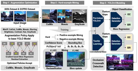 In the second phase, the pre-existing training data and the data to which the optimized augmentation policy is applied were used to extract the hard-positive example and hard-negative example groups through hard-example mining. Through hard-example mining, the data increasing the false-negative detection rate and false-positive detection rate based on the feature vector were extracted from the confidence score and bounding box parameters. As far as the hard-positive data increasing the false-negative detection rate are concerned, the reclassification of the objects of interest was performed. As far as the hard-negative data increasing the false-positive detection rate are concerned, the Bbox information of the false-positive objects was updated and applied to the detection model. In the final phase, a neural network is configured based on the YOLOv4 model, a one-stage detector, to detect the objects that occlude a crosswalk. The augmentation policies applied through the previous phases were optimized, and fine-tuning was conducted through hard-example re-leaning. This is the process of applying transfer learning to the pre-trained detection model, and has a positive influence on occluded object detection. The occluded crosswalk was detected based on the object classification and bounding box regression values predicted through the detection generator.