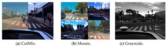 Figure 5a–c show the augmentation policies for enhancing the performance of occluded objection detection that showed positive results when applied to the learning model in this study. Figure 5a CutMix is a policy that replaces a part of one image with a part of another image to newly configure the learning data, and shows amazing performance results for being an intuitive idea [35]. Figure 5b Mosaic is a policy that mixes and uses four learning images, and shows effective performance despite the small number of mini batches [36]. Figure 5c is a policy that processes the pre-existing color learning images into black-and-white images, and enables prompt image processing by simply delivering the luminosity information [37]. The MixUp, CutOut, Blurring, Brightness, Contrast, and Hue policies other than the three described above were not selected as the policies for model optimization, since the performance changes were reduced or insignificant in the transfer learning process. Accordingly, the CutMix, Mosaic, and Grayscale policies that showed detection performance enhancements through each policy performance evaluation were accepted and used in the final model learning. In addition, since the output value representing the detection performance varies depending on which activation function is used for model neural network configuration, it is very important to use activation functions suitable for learning [38]. In this study, a robust model suitable for normalization was developed and the Mish function that prevents overfitting was used as the activation function. This allows a bit of negative numbers to exist in the output value, and is particular in that the gradient is more smoothly displayed than that of the pre-existing ReLU series function. Since this is more advantageous in finding the global optimum value, it has a positive influence on the mean accuracy [38]. In addition, in the transfer learning process of the YOLO-based model, the k-means clustering method was applied to the bounding box of the ground truth included in the learning dataset, and the optimal anchor boxes suitable for crosswalk detection were found and used for learning. K-means clustering is an algorithm that aggregates given data into k clusters, minimizing the variance between each cluster and the distance difference. Generally, the method of using k-means clustering uses the euclidean method, but when applied to anchor boxes, it is difficult to find optimal anchor boxes because they rely too much on the center point. To improve this, we apply IoU(Intersection over Union) to extract anchor boxes. This had a positive influence on the crosswalk detection performance, since it took into consideration not just the pre-existing initially set value that simply took into consideration the aspect ratio according to pixels, but also the image features of the ground truth objects of learning data [39].