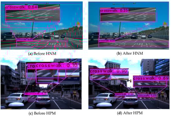 Figure 6a,b shows the detection model results acquired by using Seoul road driving images as the test data, and Figure 6c,d shows the detection model results acquired by utilizing the IARA data not used as learning data as the test data. Figure 6a shows the YOLO-based crosswalk detection results of a hard-negative example before the application of hard-negative mining. Based on the detection results, it was confirmed that the traffic information on a road that is not a crosswalk was incorrectly detected as a crosswalk, and that the confidence score value was 0.64 at that point. Figure 6b shows the detection results of a hard-negative example after the application of hard-negative mining, and it was confirmed that the confidence score value of the crosswalk was 0.25, and that the false-positive detection rate was greatly decreased. Figure 6c shows the crosswalk detection results of a hard-positive example before the application of hard-positive mining. The involved example was a representative occlusion phenomenon, and the confidence score values were 0.09 and 0.10, and it was unable to detect the crosswalk due to the block objects in front. However, as Figure 6d shows, based on the detection results acquired after the application of hard-positive mining, the confidence score values were enhanced to 0.90 and 0.89, and it was able to stably detect the objects that occluded the crosswalk in a road driving environment. The false-positive (64%) and false-negative(10%) objects generated in the pre-existing base model showed a false-positive detection rate of 25% and a true positive detection rate of 90%, respectively, meaning that the crosswalk object detection performance was greatly enhanced. As far as the real-life object detection is concerned, since the threshold value of the confidence score was 0.5, it was determined that the proposed model more stably detects crosswalk objects.