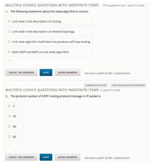Moreover, the online blended learning method proposed in this paper not only enables students to conduct online experiments and learn in an actual teaching environment; it also enables us to analyze the learning trajectories of students on experimental courses, analyze their mastery of knowledge points, and provide them with targeted guidance. For example, fine-grained learning behavior data can also be obtained. Through continuous quantitative analyses of micro-teaching activity data, the cultivation of students’ professional abilities can be tracked. This can effectively improve the quality of teaching.