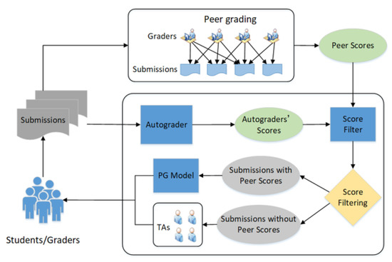 In the peer grading process, the system first assigns each grader a peer grading task. When the grader reviews a submission, the autograder will review the same submission at the same time. The result of the reviewer is passed to the grade filter. The grade filter compares the grades of the autograder and the grader. If the deviation between the two grades exceeds a predefined threshold, the grader’s grade is discarded. Under the coordination of the autograder and the grade filter, the framework divides the peer grades into two categories: a set of submissions contains the peer grades submitted by serious reviewers, which can be aggregated by the PG model to extrapolate the final submission grade; another group of student submissions without peer grades will be sent to the TAs for peer grading. In this way, we can resolve the problem caused by random peer grading, thereby improving the performance of the PG model.