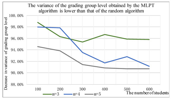Figure 9 shows the experimental results of using the MLPT algorithm for peer grading. The ordinate represents the reduction in the variance of the grading group after replacing the random algorithm with the MLPT algorithm. It can be seen that the MLPT algorithm is effective in reducing the variance in the grading group level, especially when the number of participating students is small and the redundancy is small, under which conditions the advantages of the MLPT algorithm are more prominent. The MLPT algorithm solves the problem of unreasonable task allocation in peer grading.