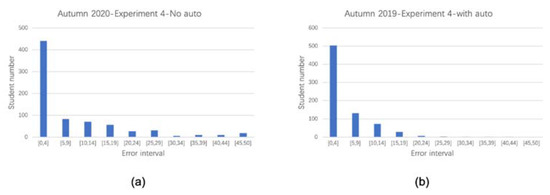 Table 5, the error grade is taken as the absolute value of the difference between the grader’s peer grade and the final real grade for the same submission. The purpose of the RMSE in the table is to measure the degree of dispersion of the data. It can be seen from the table that an autograder was not added to experiment 4 in the fall of 2020, while it was added in the autumn of 2019. The error mean and standard deviation of the latter both decreased, and the RMSE value decreased by 6.39 points, or 82.77%. The data show that after adding an autograder, the gap between the peer grade and the actual grade is significantly reduced, which means that the quality of student peer grading is significantly improved. By eliciting truthfulness via machine-learning in the peer grading process, the seriousness with which students take peer grade is effectively improved.