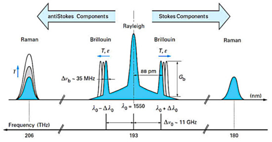 There are three types of scattering: Rayleigh scattering, Raman scattering, and Brillouin scattering. The frequency spectrum in Figure 1 [2] shows the scattering and frequency band that correspond to 1550 nm incident light.