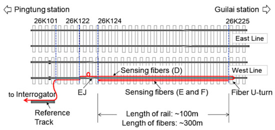 For this test, we chose a portion of railway that is an operational line in Pingtung, Taiwan, as the test field. The outline is shown as Figure 2. The adhesion locations (D, E, and F) of the measuring optical cable are shown in Figure 3. Figure 4 shows the cable after adhesion. The set-up of the reference rail is shown in Figure 5. A schematic of the data collection and internet communication structure is shown in Figure 6.