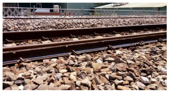 The test section is a standard 60 kg/m ballast track. The tested rail starts at the expansion joint (EJ) and extends 100 m in the direction of increasing length. It belongs to the movable section of the continuous welded rail (CWR) and covers all accessories of track engineering, such as the fish plate, welding points, and fasteners.