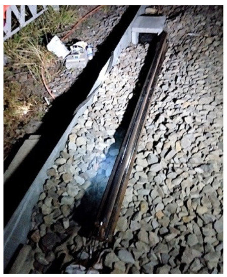 We set the measurement reference track parallel to the side of mile 26K101 and kept it 2 m from the tested rail. The reference track and the tested rail were at the same ambient temperature and had the same coefficient of thermal expansion, so they can be regarded as having the same temperature. We placed three sensing fibers on the reference rail in parallel to those of the tested rail; the setting of the reference track is shown in Figure 5.
