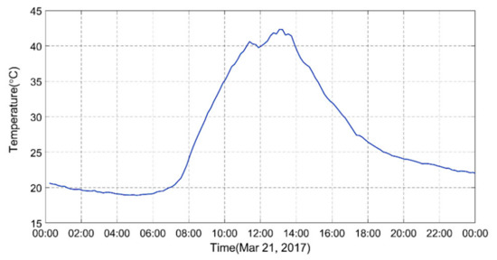 Since the reference track and the tested rail were in the same ambient temperature conditions, the specifications of the reference track were the same as those of the tested rail and had the same thermal expansion coefficient, so the temperature measured from reference track was considered to be the same as the temperature of the tested rail. The measured temperature curve is shown in Figure 7.