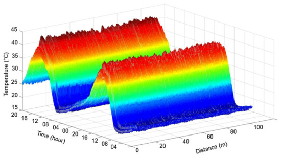 Though the temperature curves of traditional measurements can only represent single locations, Figure 8 shows the temperature changes of the tested rail under continuous monitoring for 48 h, as well as the distributed temperature according to the entire 100 m length rail. The coordinates of Figure 8 use temperature value, time, and length for its three-axis analysis graph, showing the temperature changes of any rail position at different times.