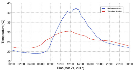 The temperature profile of the reference track: the temperature measured from the reference track, which was also used as the temperature of the tested rail.