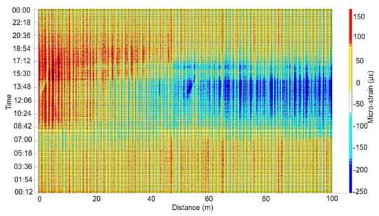Figure 10 shows the intensity of the strain distributed over the tested rail in the 24 h test period. The calculation was based on the BFS of the reference track in Equation (5):