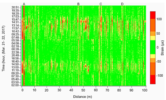 Based on the measurements of the distributed fiber optic sensing system that was used in this test, Figure 11 shows the strain data of the tested rail. The four areas of A, B, C, and D sustained strain, indicating that these places are more abnormal than others. The picture shows that the steel rail repeatedly experienced similar strain. The railway experienced greater strain at times where temperatures were higher (09:20~14:50) and lower strain when temperatures were lower. This explains the accumulation and release of the stress of the steel rail. The areas A, B, C, and D experienced high strain for long periods of time. Relevant railroad personnel should examine these abnormal spots.