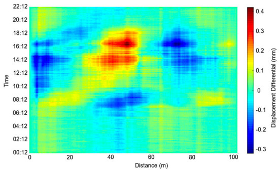 Through the calculation of strain distribution data from Figure 11, we created Figure 12, which is easier to comprehend. This displacement distribution can be provided to railway management to assess abnormal railway data. In Figure 12, there are some significant regions—both the stretched (red) and compressed (blue) regions—that are different from other regions with zero displacement.