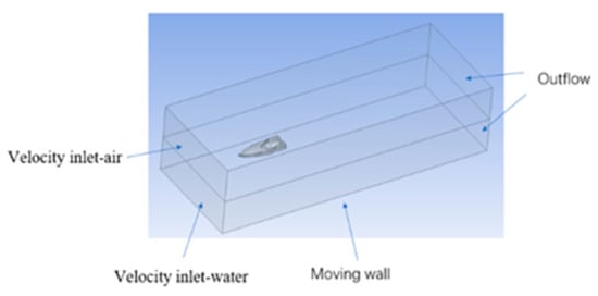 The types of boundary conditions mainly include the velocity inlet (inlet), outlet (outflow), solid wall (wall), water surface (VOF), etc. The established fluid domain, namely the air domain and the water domain, are built in the same module, and there is no need to set the gas–liquid interface [34]. The surface of the ship as a wall and the specific value of the velocity inlet according to different schemes, so that the air velocity was the same as the water flow velocity. The flow outlet is a fully developed flow. We set the hull surface and other outer boundaries as smooth, impenetrable walls with a given roughness. The bottom surface of the water area, due to the relative movement between the riverbed and the hull, it was set as a moving wall, and the other walls were set as non-slip walls.