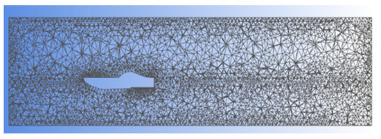 Considering the complexity of the surface shape of the unmanned ship, we first used Hypermesh to generate a hybrid surface mesh, with a size of the unit mesh of 2–4 mm. The volume grid was generated by the surface mesh. The initial number of meshes was about 340,000. The total number of grids after mesh refinement was approximately 10.23 million. The mid-section mesh is shown in Figure 3.