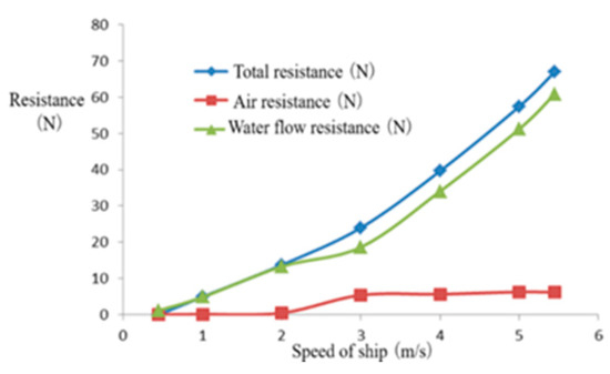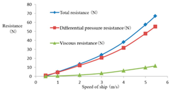 The law describing the relationship between water or air resistance and speed with regard to an unmanned ship is shown in Figure 4, and the law describing the relationship between viscous resistance or differential pressure resistance and speed is shown in Figure 5.