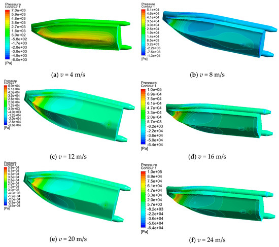 As can be seen from Figure 9, the bow part of the unmanned ship when sailing is positive pressure, the tail of the unmanned ship will form a negative pressure zone, and with the increase in speed, its absolute value is increasing rapidly, such as when the speed is 4 m/s, the maximum pressure at the first of the unmanned ship is 6874 N, when the speed is 24 m/s, the maximum pressure can reach 238,869 Pa, and the pressure at the bow of the ship and the pressure difference between the middle part of the ship is also increasing. As can be seen from Bernoulli’s principle, different flow rates can lead to different pressures, and where water flows faster, unmanned ships are less under pressure. The front and rear parts of the unmanned ship are subjected to a large pressure, which can be reinforced in the process of the design of the unmanned ship structure, and improve the pressure resistance of the unmanned ship. At the same time, the low pressure at the tail will cause fluid back-flow, so the fluid velocity near the tail will be slow. Depending on the ship type, the water and air flowing in the Y direction will partly acquire lateral velocity when they hit the wall of the unmanned ship.