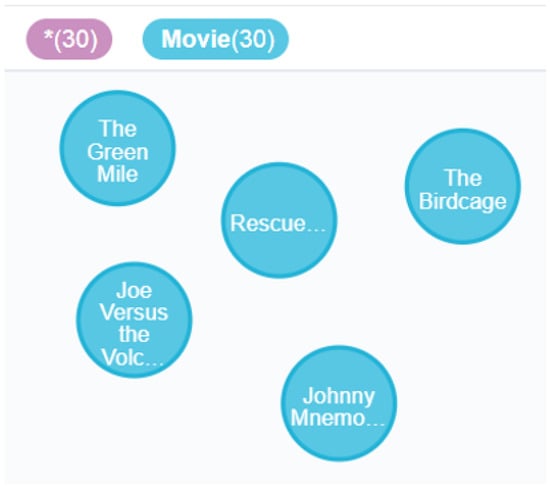 Knowledge graph recommendation system is applied to many fields, such as smart social tv [], personalized user recommendations [,,], etc. However, in recent years, the movie knowledge graph has only just started. Although many scholars have studied knowledge graphs for movie recommendations [,] and used graph databases for recommendations [,], these studies still have many drawbacks and need to be continuously studied. Due to the real-time, richness and particularity of movie data, the movie knowledge graphs need to be continuously modified and improved to adapt to the changing and complex data in different scenes. This has become the difficulty of movie recommendation based on the knowledge graphs.