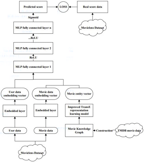 The purpose of knowledge graphs is to show entities, events and their relations in the real world in a structured form, and to present Internet information in a way that people can easily understand. Its essence is a knowledge base with a directed graph structure []. In order to improve the effect of recommendation, more and more researchers begin to study the recommendation model based on knowledge graphs. This recommendation method not only integrates the external rich semantic information of item entities, but also introduces the association information between items, which can effectively alleviate the problem of data sparsity and cold start []. At the same time, through the structural display of knowledge graphs, various complex relations between projects can be displayed vividly. Therefore, the hybrid recommendation model that introduces the knowledge graphs has become a trend of current research [].