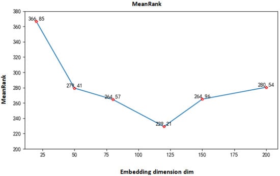 Under normal circumstances, the better the model effect, the smaller the MeanRank value and the larger the corresponding hits@10 value. It can be seen from Figure 11 that when the embedding dimension is low, the MeanRank value is relatively large, that is, the correct triples are lower in the sorting. As the dimension increases, the MeanRank value keeps decreasing, and reaches the minimum when the dimension is 120. The minimum value is about 229. After that, it keeps getting bigger.