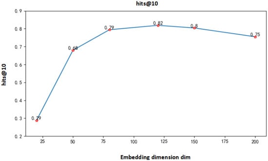 It can be seen from Figure 12 that when the embedding dimension is low, the value of hits@10 is smaller. As the dimension increases, the value of hits@10 becomes larger. When the dimension is 120, it reaches the maximum value of about 0.82. After that, it keeps getting smaller.