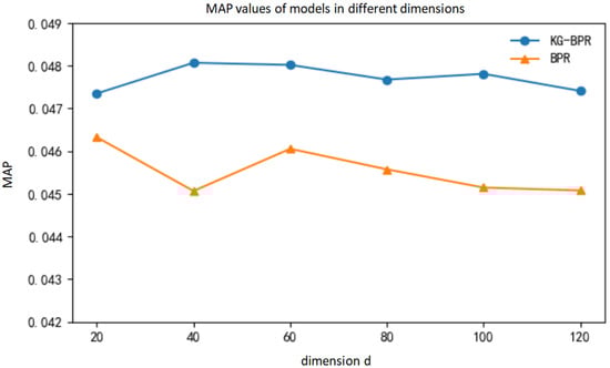 It can be seen from Table 4 that when the dimension d is 40, the KG-BPR model has the best effect and the MAP value is the largest, which is 0.04807176. Through comparison, it can be found that due to the introduction of knowledge graphs in KG-BPR model, the MAP value of the KG-BPR model is improved in any feature dimension and the recommendation effect is better compared with BPR model.