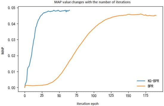 It can be seen from Figure 15 that the MAP value of the KG-BPR model has stabilized after about 40 iterations, while the BPR model needs to be iterated about 150 times before it stabilizes. Therefore, the introduction of the movie entity vectors speeds up the training of model parameters. Furthermore, it can assist the model to generate user feature matrices and movie feature matrices for recommendation faster and better.
