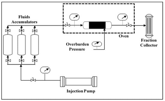 In this work, different experiments were conducted including coreflooding, contact angle, interfacial tension, and dynamic adsorption measurements. The coreflooding experiments were conducted using 6-inch-length and 1.5-inch-diameter core samples. All experiments were conducted at 100 °C and a 500 psi backpressure and at an injection rate of 0.5 cm3/min. The coreflooding setup (Figure 1) consists of an oven, a core holder, an injection pump, a pressure controller, and transfer cylinders. The core holder and the injection pump are positioned horizontally to minimize the gravity effect. The coreflooding experiments were conducted by first saturating the rocks with the formation brine and then the core samples were flooded with oil. The flooding setup was used to inject oil into the rock samples displacing the brine out of the cores, and the produced effluents were monitored. The maximum oil saturation was achieved, once no more brine is coming out of the rocks, indicating the rock samples were at the irreducible water saturation and maximum oil saturation. Thereafter, the samples were aged at high-pressure and high-temperature conditions to ensure reasonable reservoir conditions. The samples were aged at 100 °C and 2500 psi for two weeks to ensure that the rock samples are saturated with the oil. The flooding experiments were started by injecting SW as a secondary recovery process, until no more oil was produced. Thereafter, a GLDA solution was injected in a tertiary mode, until no more oil was recovered.